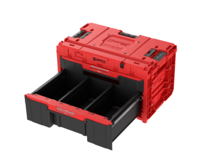 Qbrick System ONE Drawer 2 PLUS Toolbox 2.0 RED Ultra HD to bardzo duża, zaawansowana skrzynka narzędziowa z dwiema wysuwanymi szufladami o różnej wielkości, które poruszają się płynnie po solidnych, aluminiowych prowadnicach. Skrzynia już w standardzie została wyposażona w 17 wyjmowanych przegród (15 niskich oraz 2 wysokie), które pozwalają stworzyć maksymalnie zawrotne 19 komór (16 w niskiej szufladzie oraz 3 w wysokiej). Pozwala to na elastyczne dostosowanie przestrzeni ładunkowej w każdej z szuflad według własnych potrzeb.